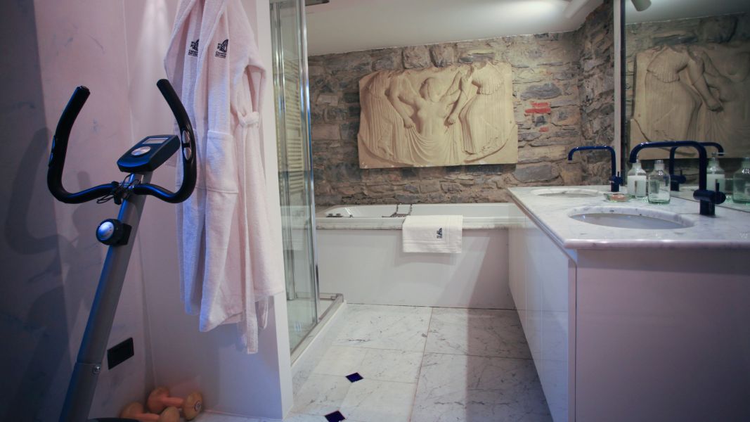 Il bagno privato, spazioso e rifinito in marmo, è dotato sia di vasca da bagno che di doccia, oltre a una cyclette per chi desidera dedicarsi al benessere anche in viaggio. L’arredamento è composto da mobili antichi, scelti nel rispetto dello stile e della storia del Convento, che rendono l’ambiente caldo e raffinato.