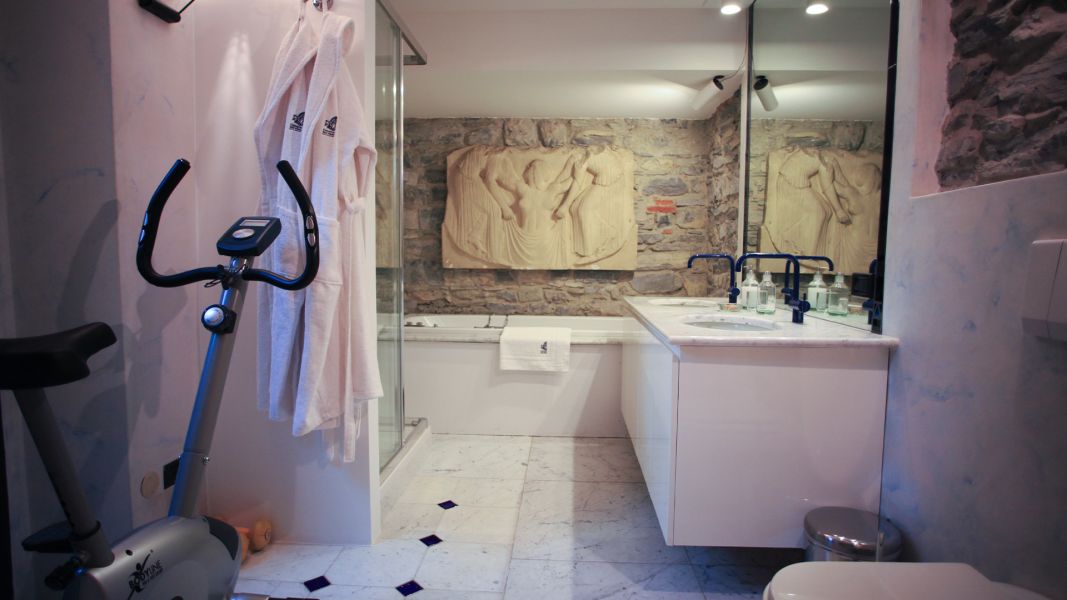 Il bagno privato, spazioso e rifinito in marmo, è dotato sia di vasca da bagno che di doccia, oltre a una cyclette per chi desidera dedicarsi al benessere anche in viaggio. L’arredamento è composto da mobili antichi, scelti nel rispetto dello stile e della storia del Convento, che rendono l’ambiente caldo e raffinato.
